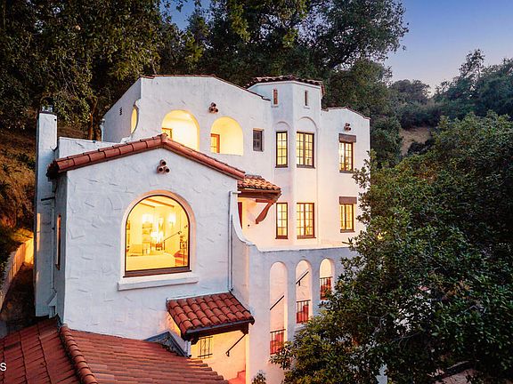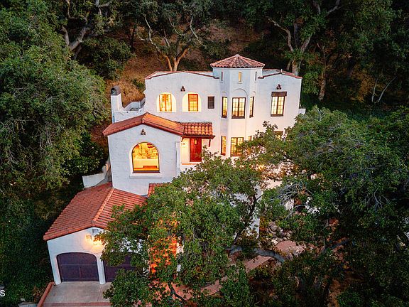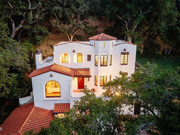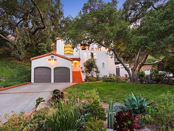 Delightfully poised within the tranquil Verdugo Woodlands neighborhood of Glendale, this refined 1928 Spanish Colonial Revival welcomes serene living within a thoughtfully composed 2,277 SF. Noted as one of the first homes to be built on San Luis Rey Dr., this architectural jewel has been lovingly preserved with original details throughout. Updated with preservation and cohesiveness in mind, the home welcomes modern living while maintaining a romantic and timeless aesthetic. With striking curb appeal, an arched entry staircase welcomes you to a landing above. Upon entry, hardwood floors skip trowel walls sweep the space. A step-down living room lies to the left, and offers the perfect space for rest and entertainment. With a vaulted and beamed ceiling, the airy room is accentuated by a picture window that permeates natural light, while granting treetop views of the hills beyond. Tastefully restored, a fireplace warms the space, with tile surround and wood block mantle. Built-in bookshelves flank a staircase that leads to an additional space, perfect for a home office or reading room. From the entry, a welcoming dining room opens from arch doorways into an additional eating room. The kitchen sits beyond and is complete with recent updates throughout including stainless steel appliances, custom cabinets, farm sink and built in wine refrigerator. Hidden within, a stacked laundry serves the house with function in mind. Completing the first floor, a guest bedroom and guest bath are located beyond the entry while giving private access to the back patio through French doors. The second floor is composed of an additional guest bedroom with a covered patio. An additional updated bathroom rests down the hall with stylish finishes. The primary suite lends quiet and spacious privacy with a cupola ceiling, sitting area and surrounding windows. Finishing off the retreat, a refined bathroom with double sinks, Custom cabinet and stone feature wall is lit from a skylight above. Enjoy breezy afternoons on the patio in the backyard while resting among the treetops. Close to Verdugo Park, Montrose and Oakmont Country Club.