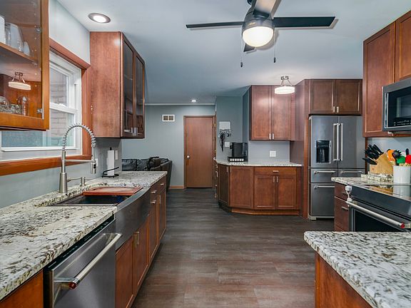 Great 3 bedroom 1.5 Bath Ranch. All new electrical, new roof (2024) concrete driveway, stairs and sidewalk (2023). Completely Renovated Kitchen includes granite countertops, farmhouse sink and stainless steel appliances. Wood Burning Fireplace in family room. Partially finished basement is perfect for a 2nd family room with separate space for a home office or playroom. Oversized deck with fenced yard and fire pit is a wonderful place to entertain.
