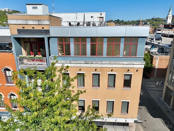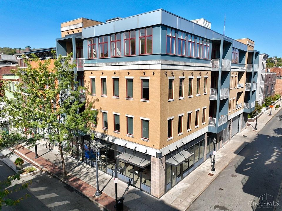 Coveted top-floor corner unit at Trinity Flats in Over-the-Rhine with views of Music Hall! Located high above Vine Street, this 4th floor 1,147sf condo provides both privacy & convenience just a few steps from the best restaurants & bars in OTR. Western exposure, 11ft high ceilings & oversized windows provide lots of natural light. Updated bathroom w/new tile, floor & vanity. New AC compressor, coil & air handler in 2024. 1 covered & secure garage parking spot. Zero step access into the unit & elevator runs from the 1st floor to the communal roofdeck. No short term rentals allowed. Do not miss out on this one of a kind condo!