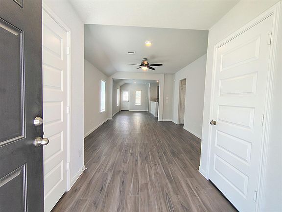 Welcome to this brand-new single-story home in the highly sought-after River's Edge community of Conroe, zoned to top-rated The Woodlands schools. This 3-bedroom, 2-bathroom residence features an open-concept layout with luxury vinyl plank flooring throughout no carpet. The gourmet kitchen is equipped with 42" cabinets, granite countertops, and stainless-steel appliances. The Owner's Suite offers a bay window, oversized shower, walk-in closet, and tray ceiling. Additional features include a covered patio, sprinkler system, and a private backyard. Refrigerator, washer, and dryer are included. With a 2-car garage and modern finishes, this home is move-in ready.