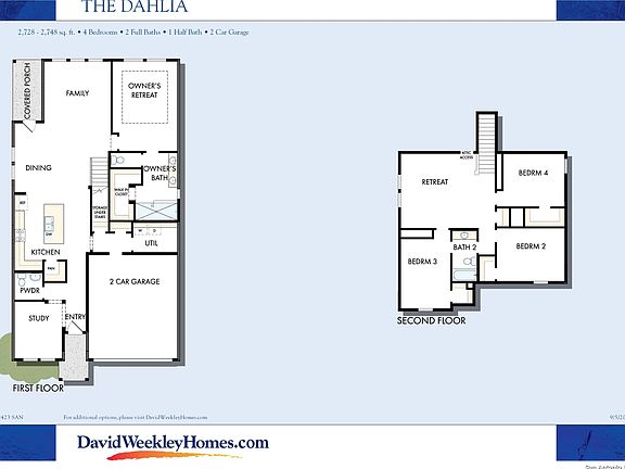 Bright, adaptable two-story home: 2,728 sq ft, 4 beds, 2-car garage, study. Open layout bathes in natural light. Up top: 3 junior beds, shared bath, retreat. Kitchen features center island, pantry, open sightlines. Owner's Retreat with luxe bath and walk-in closet.