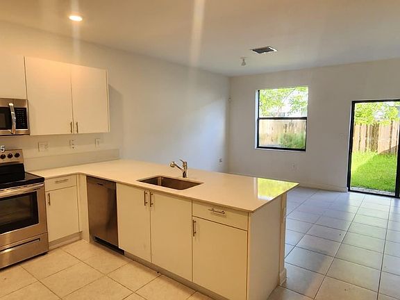Modern 3-bedroom, 2.5-bath townhome for rent in Pine Vista, a new Lennar community in Homestead. Features include a spacious open kitchen with white cabinetry and stainless steel appliances, tile flooring on the first floor, carpet upstairs, and a private fenced backyard. Includes washer and dryer, and two detached parking spaces in front of the unit. Conveniently located near Homestead Speedway, restaurants, shopping, and the Florida Turnpike.