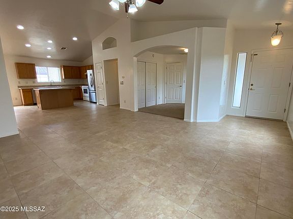 Overlook at Rancho del Lago - Rincon Mountain views! Great Room plus Den, 3 Bedrooms, Laundry Rm, 2-car Garage and a covered patio. Split floorplan, vaulted ceilings, decorator niches and plant shelves. Tiled floors, carpeted bedrooms. Custom tiled full shower in Primary Bath and Bath 2 tub/shower. Refrigerator, electric range, washer, and new dishwasher. Rollouts in the kitchen cabinets. Hot water heater was replaced in 2024. Elevated corner lot with a walled backyard. Easy care landscaping. Low HOA only $24/mo! Close to Old Vail Middle and Cienega High schools. Convenient to groceries, gas, golf, biking, hiking and restaurants. Easy access to I-10.