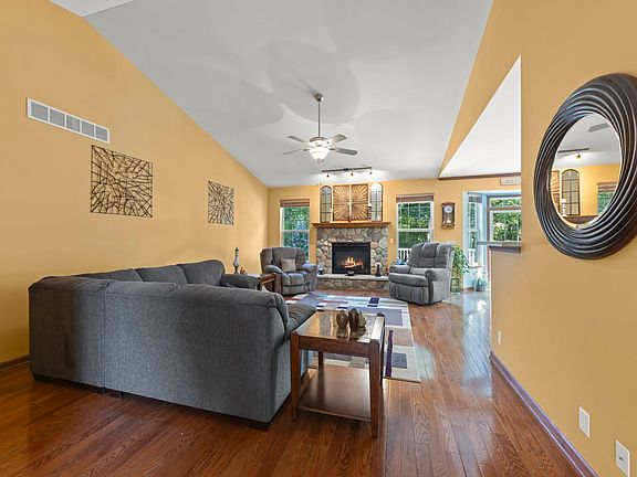 Welcome to this spacious ranch in the peaceful Walnut Woods subdivision of Sugar Grove, where serenity and tranquility are at their finest. This 4-bedroom, 3-bathroom home with a 3-car garage is perfect for those seeking convenience without too many steps. As you enter, you'll be greeted by a warm and inviting atmosphere, with the dining room to the right, a spacious laundry area to the left, and the living room straight ahead. The living room boasts a cozy gas fireplace, perfect for relaxing evenings. The large eat-in kitchen is ideal for daily meals and entertaining, while the master bedroom offers ample space, a walk-in closet, and an en suite bathroom for your comfort. Savor the pristine hardwood floors on the main level, excluding the bedrooms. Need more space for family and friends? The finished basement is a true highlight, featuring a stunning handcrafted bar with another fridge, perfect for hosting parties or enjoying a laid-back weekend. The basement also includes a guest bedroom and bathroom, with beautiful woodwork and plenty of room to relax and entertain. Step outside to enjoy your peaceful backyard, surrounded by the beauty of nature next to the forest. Whether you're sipping your morning coffee or grilling out on a summer day, the back porch offers a serene retreat. Additional updates include a 2020 fridge, a 2021 garbage disposal, the microwave is just a couple of years old, a brand new seal-coated driveway, a 2022 hot water tank, and a 2023 central air system. This home also features a 200-amp electrical service. Conveniently located near Aurora West Forest Preserve, Prestbury Country Club, Blackberry Farm, Woodman's Food Market, Jewel Osco, Target, I-88, and more, this home offers the perfect combination of peaceful living and easy access to local amenities. Stop by Ed and Judie's Egg Farm which is close by. Beautiful memories await in this wonderful community. Home starts here!