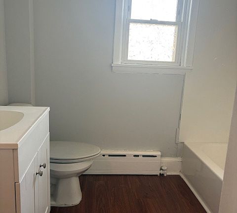 Inside, you'll find a large eat-in kitchen featuring stainless steel appliances and a rear door that opens to your own private terrace, perfect for relaxing, morning coffee, or outdoor dining. The unit has been completely refreshed with brand-new flooring, fresh paint throughout, and a new bathtub/shower in the updated bathroom.
