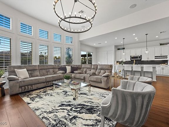 Guard-gated Renaissance at Seven Hills luxury! Elegant single-story home on the Rio Secco Golf Course with 12-ft ceilings, 3 beds + den, and 2.5 baths. Enter through a sunlit courtyard with French doors into open living spaces featuring two floor-to-ceiling gas fireplaces and plantation shutters. The gourmet kitchen offers granite counters, island, custom backsplash, and stainless appliances. The oversized primary suite has direct backyard access and a spa bath with dual vanities, soaking tub, walk-in shower, and closet. Step outside through new Andersen sliders to a resort-style backyard with infinity-edge pool & spa, new heating system, new deck, custom cabana, and mature trees framing breathtaking golf course & mountain views. Upgrades include two A/C units (one new) and whole-home water filtration. Minutes from The District at Green Valley Ranch and top schools—move-in ready elegance!