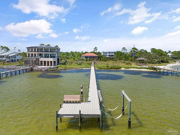 This waterfront home with 120’ feet on the Santa Rosa Sound in highly desirable Gulf Breeze Proper is the epitome of Gulf Coast living. Walls of windows capture spectacular views of emerald green waters, while capitalizing on the abundance of natural light from the open concept living, dining and kitchen areas. Appointed with Travertine tile, arched transom windows, neutral color palette, recessed lighting, coffered ceilings, and office with French doors and hardwoods. The eat-in kitchen is equipped with top of the line stainless Sub Zero refrigerator, Thermador 6 burner gas range, double oven, granite countertops, modern white shaker style cabinetry, backlit upper glass display fronts and oversized waterfall Quartz countertop island. The kitchen dining area is perfect for more casual dining, while the formal dining room caters to more intimate hosting. The kitchen flows into a secondary living room anchored by a wall of built-ins and direct access to the spacious screened lanai with hot tub and outdoor kitchen, creating an extension of the home's interior floor plan. The main floor master bedroom is a private oasis. Complete with walk-in closet, high ceilings, and plantations shutters. The spa-like ensuite bath features dual vanities, marble countertops, soaking tub, separate shower with glass block, Travertine tile, and marble accented floors. Each additional light-filled bedroom is equally well appointed and offers flexibility for guests or a growing family. Not to be overlooked, the laundry room provides sink and additional storage while the garage area, with elevator, is a car and outdoor enthusiast's dream offering space for multiple vehicles, golf cart, kayaks, paddleboards, jet skis and only steps to the boardwalk and new Thru Flow dock with boat lift, water and electricity. Within walking distance to schools. With endless potential to customize, this property is truly a blank canvas and ideal for those seeking a primary residence or second home investment.