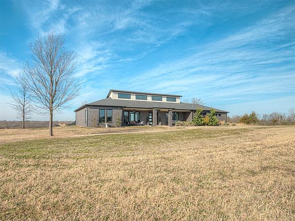 Welcome to a rare opportunity to own a turnkey equestrian property where modern luxury meets wide-open Oklahoma living. This custom home sits on 40 private, perimeter-treed acres with income-producing hay fields, a fully stocked pond & thoughtfully designed horse facilities—ideal for serious riders, hobby farmers, hunters, or those seeking space, privacy, and beauty. THE HOME: 2,897 sqft of open-concept living with 10-ft ceilings throughout. Dramatic 20-ft vaulted ceiling with clerestory windows in the great room, kitchen, and dining area. 4 spacious bedrooms with large closets & 3 full bathrooms. Anderson windows provide exceptional natural light. Sleek black-and-white modern interior featuring 8-ft doors, quartz countertops, and matte black fixtures Gourmet kitchen with oversized island, stainless steel appliances, and a walk-in pantry. Oversized 3-car attached garage & in-ground shelter. Expansive covered front porch with oversized swing. Covered back patio overlooking the fenced backyard and open land beyond. EQUESTRIAN & LAND FEATURES: 72x150 regulation-size steel-piped sand riding arena, 36x60 insulated custom horse barn, landscaped & Anderson windows designed to complement the main home. 4 black powder coated 12x12 steel stalls by Innovative Equine Systems with white-washed pine walls. 2 Dutch turnout doors opening to a 1-acre fenced turnout and front double sliding doors by Classic Equine Equipment. Spray-foam insulation, electric & plumbing, custom fans and lighting throughout. Stunning brick wash/grooming stall. 8-acre pipe-and-cable fenced pasture for safe turnout and rotation. Remarkable privacy, wildlife habitat, and excellent hunting. (deer & turkey) This property boasts truly breathtaking panoramic scenery, showcasing the best of Oklahoma's wide-open vistas and tranquil rural charm. Custom brick & iron gated entrance with landscaping. Ask Agent for more details.