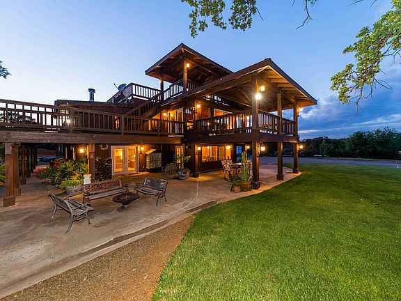 "The Fort". Truly magnificent property with 3 stories of decking and views on every perch located off a private shared runway. Off grid system, the fort includes a detached game/bar room that looks down into a custom racquetball court, underground rooms for sleeping, working out and bathroom. Property includes a 6000 sq ft wood stove heated garage/perfecting for running a large business, overhead crane capable of lifting 10,000lbs, 38ft hanger doors, carport, storage & 2000 sq ft 3 sided carport, and an attached office with a 14x40 roll up door. Within the garage there is a 2 stage air compressor plumbed throughout shop, siren driver alarms, fire fighting system, 3000 gallon backup water tank, and automatic start generator. The main home has the entire second floor as the master suite with private decking for viewing the runway. Jaw dropping vaulted entry way, living room and family room. A private dining area with views of the runway and large front yard and koi pond.