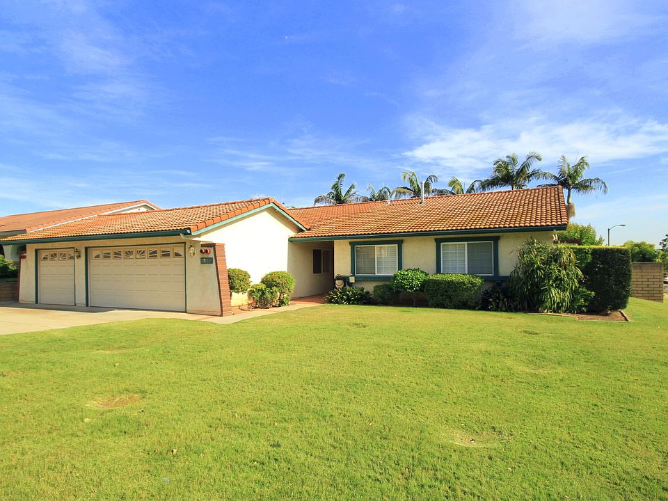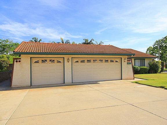 SINGLE STORY, EXCELLENT LOCATION IN NORTH LA VERNE. Well maintained four bedroom home located near Oak Mesa Elementary school. A covered entry way with brick laid flooring leads to the front door. Entry opens to a formal living room offering wood shutters and a view of the backyard. The formal dining area offers a light fixture and wood shutters. The family room features a brick fireplace, slider with access to the backyard and covered patio. The kitchen is open to the family room and offers plenty of cabinet space, counter space, recessed lighting and crown molding. The master bedroom is very generously sized with spacious closets, direct access to the master bathroom & a slider to a private covered patio. Master bathroom offers counter space, tile flooring and a shower/tub. Three other spacious bedrooms and a full guest bathroom with dual sinks, tiled floors and a remodeled shower. The three car garage is finished and offers a workshop area. The backyard features a covered patio with concrete decking, grass area, spacious side yard, landscaping and block walls all around. The home features all new dual paned windows, dual paned sliding doors & wood shutters on the windows.There is a mountain view to the north from the backyard & from the front yard!