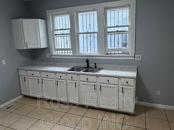 Bright kitchen with ample cabinet space, double sink, and tile flooring
