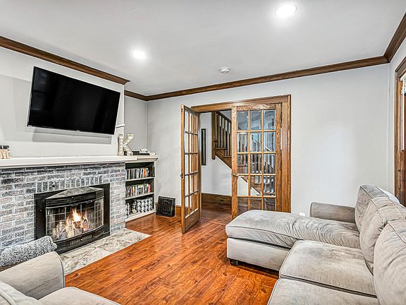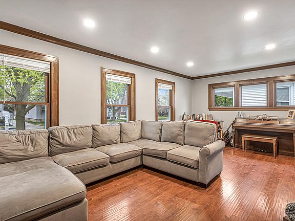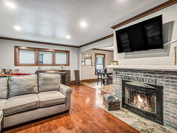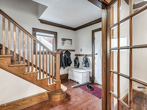 Welcome home to this spacious 3 bedroom w/ natural woodwork, crown moulding, hardwood floors throughout. Open living area w/recessed lights, updated kitchen w/freshly painted cabinets, kitchen appliances included, and patio doors out to a deck with a whimsical play house, fenced in yard. There's even finished attic space, great for storage or a reading nook. Newer roof (7 yrs), replacement windows, and drain tile system in basement, plus half bath and storage areas. One car detached garage, off-street parking for 2-3!