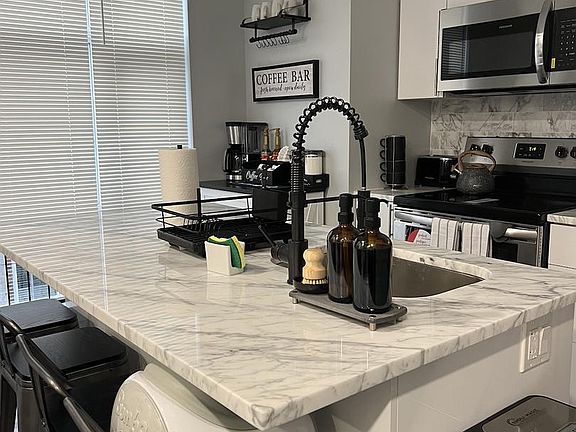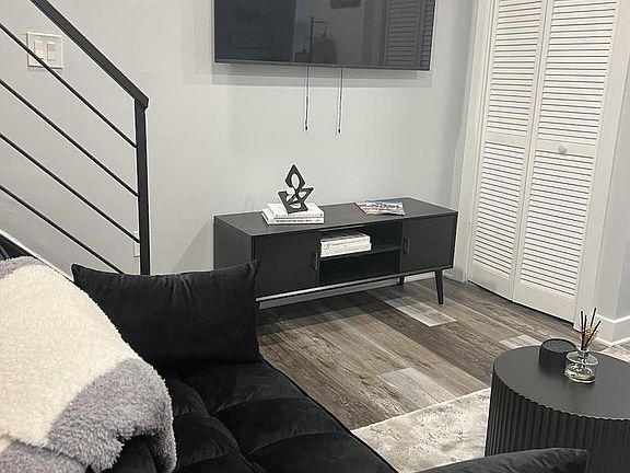 The open living area flows seamlessly into a gourmet kitchen with stainless-steel appliances, quartz countertops, and custom cabinetry. Both bedrooms are well-proportioned with excellent closet space, and the bathroom showcases sleek tile work and designer fixtures.