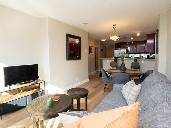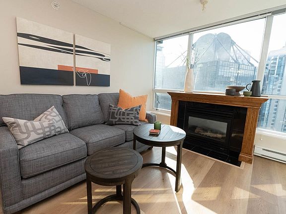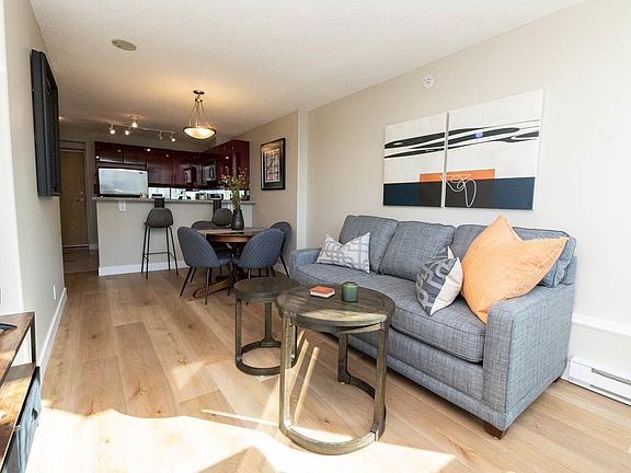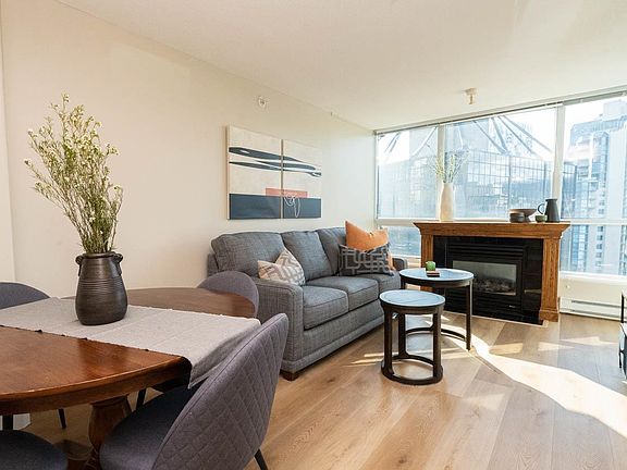 Min 3 mo term. FURNISHED 609 sq ft 1 bed + den condo in Coal Harbour. Open layout w/ floor-to-ceiling windows with mountain, water + city views. Kitchen features s/s appl, gas range, stone counters, built-in microwave + breakfast bar. Living rm has hardwood flrs, gas F/P + La-Z-Boy queen sleeper sofa. Bdrm fits queen bed + opens to covered balcony w/ composite decking + 2-seat patio set. Den is set up as dedicated workspace w/ desk + chair. Bath includes high-pressure shower. In-suite laundry + good closet space. Bldg. amenities: indoor pool, hot tub, dry sauna + fitness centre. Steps to Seawall, Stanley Park, marina, cafes, dining, groceries, Robson St + transit. Rental includes: Heat, hot water, gas, electricity (capped at $70 per months), internet, cable, monthly clean, 1 prkg. No Pets