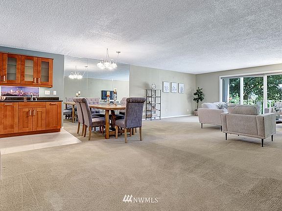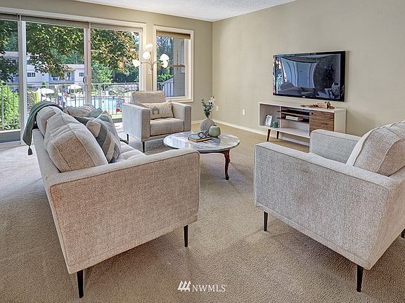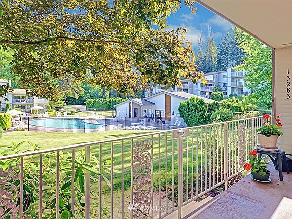 Gorgeous North Seattle ground floor garden condo. Walk out from the spacious deck directly to the pool in the pristine natural setting with green spaces all around. Tons of storage in the updated galley kitchen with custom hardwood cabinetry. Owners king-size bedroom has custom closets & private bath. Additional bedroom--just as large--can also accommodate an office space. Pantry storage & laundry area in the unit. Community boasts pool, hot tub, sauna, club house & more. Next door to Jackson Park Golf Course, plus short walk to shops & restaurants. Catch bus @ 15th; just minutes to light rail station & easy commute downtown!