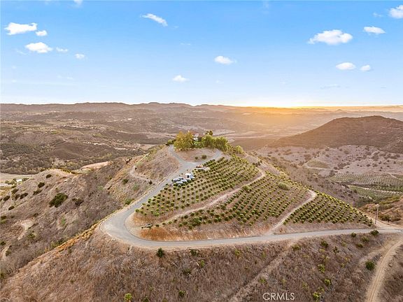 Welcome to your exclusive 36+ acre private retreat! This stunning, custom-built Mediterranean estate offers a truly unparalleled living experience, featuring breathtaking 360-degree panoramic views—from the serene surrounding mountains to the sparkling Pacific Ocean on clear days. Whether you’re taking in the vibrant sunsets or sunrises from the comfort of this unique hillside home, you’ll be enveloped by natural beauty at every turn. Inside, discover a luxurious yet inviting design across nearly 3,000 square feet, with elegant casement windows, French doors, and expansive skylights that flood each room with light. The home offers three distinctive fireplaces, enhancing the charm and warmth of every space. The gourmet kitchen is a chef’s dream, equipped with top-of-the-line appliances, including a SubZero refrigerator, a Thermador professional range, and Bosch dishwasher. The open kitchen layout, with an island and bar seating for seven, makes it perfect for entertaining or intimate family gatherings. Upstairs, the master suite is a peaceful haven with a cozy dual-sided fireplace, custom artistic tile work, and a private balcony offering sweeping views. The luxurious master bath features a spa tub and a unique walk-in shower, providing both style and comfort. The downstairs bedroom with its own entrance and bathroom is ideal for guests, and an additional bonus room with a charming beehive fireplace can serve as an office or optional 4th bedroom. The custom roll-up wood door adds flexibility for entertaining or creating separate spaces as needed. For those who appreciate both elegance and functionality, this estate includes a three-car garage with custom maple cabinetry, perfect for a hobby room, art studio, or workshop. The home also features dual AC units, ceiling fans, a whole-house water filtration system, and a central vacuum system for convenience. Recently painted throughout, this home is ready to welcome you. Set among certified organic citrus groves, the property boasts over 1,100 golden nugget tangerine trees and near 50 flourishing avocado trees. Embrace a sustainable lifestyle with the fully owned, new 18.40 kW DC solar system, a solar-powered well, and solar-powered water tank pumps, all equipped with transferrable warranties. If you’re seeking a tranquil yet luxurious retreat with room to grow, this hillside estate offers it all—privacy, panoramic views, and exceptional amenities. No HOA fees, no Mello Roos, just pure, private paradise!