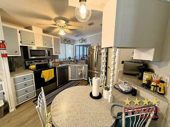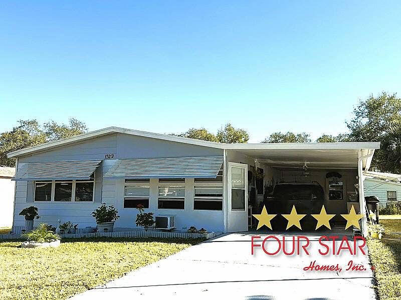 Discover this 1,344 sq ft home featuring an air-conditioned tiled lanai, perfect for relaxing or entertaining. The open-concept layout connects the family and living rooms to a kitchen with newer stainless appliances and a breakfast bar. The dining area includes a built-in hutch for extra storage. The spacious primary bedroom boasts an ensuite with double sinks and a walk-in shower. Additional conveniences include an inside laundry room with access to an outdoor shed, an oversized carport, and a large driveway. Located in La Costa Village, enjoy resort-style amenities: a pool, clubhouse, tennis courts, billiards, and more. This pet-friendly, motorcycle-friendly community is just minutes from the beach and local conveniences. Sellers are motivated. Schedule your private showing today!