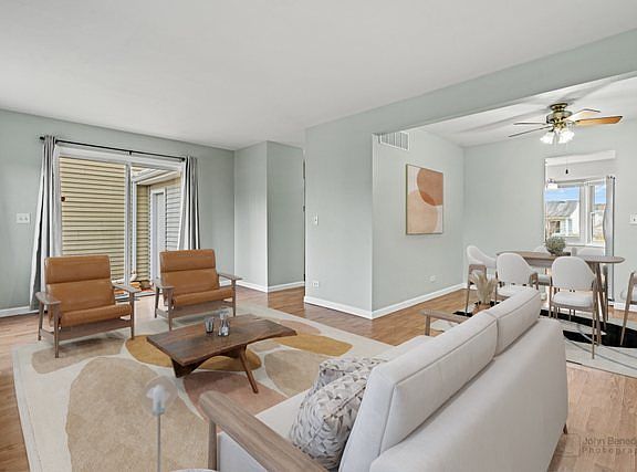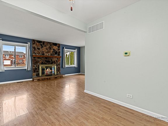 This beautifully updated 2-story duplex is ready for new homeowners! Located in a prime spot, this end unit offers the advantage of NO HOA fees and provides a generous 1332 square feet of living space. With a partially finished basement, there's an extra bedroom for added flexibility and storage. The spacious kitchen boasts laminate flooring, a cozy eating area with a bay window, a new fridge (2024), and a newer microwave (2023). The large, inviting living room features a wood-burning fireplace with a stone surround, perfect for cozy nights. Upstairs, the Primary bedroom includes a walk-in closet and shares a beautifully updated full bath, complete with a new toilet, vanity, lighting, and flooring. The second floor is enhanced with new carpet, and throughout the home, you'll find new doors and trim, fresh paint, and new lighting. Other recent updates include the main level hall bath, some newer windows, an A/C unit that's 5 years old, and a roof that's 12 years old. Enjoy your own private patio and there is guest parking available. This duplex is in a great location, just a short walk from the Forest Preserve. With nothing left to do but move in, this home is perfect for those seeking comfort and convenience!