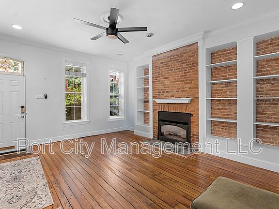 Spacious Living: Step inside to discover the original hardwood floors and an inviting living room featuring an exposed brick fireplace with custom built-ins. The fresh paint throughout adds a modern touch to the classic charm of this 15 ft. row home.