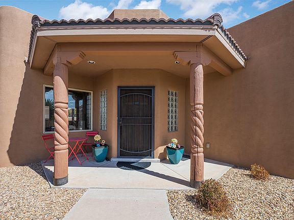 Beautiful home in Trinity Estates that offers room for all to enjoy. This open floor plan makes entertaining or enjoying family/friends a breeze. The kitchen boast stainless steel appliances, granite counter tops, custom lighting and eating bar. Living room opens up to the dining room and kitchen. Warm yourself by the kiva fire place and put your art work in the nichos for all to enjoy. Primary bedroom is spacious enough for a sitting area to enjoy and relax. Soak the day away in your garden tub. No carpet. Relax in your backyard under the covered outdoor patio. Appliances are newer and the refrigerator, washer/dryer are all 2 years old - conveying with the home. Nice three car garage gives added space for storage or the extra vehicle. Commute with ease. Come by and stay awhile, you won't be disappoint