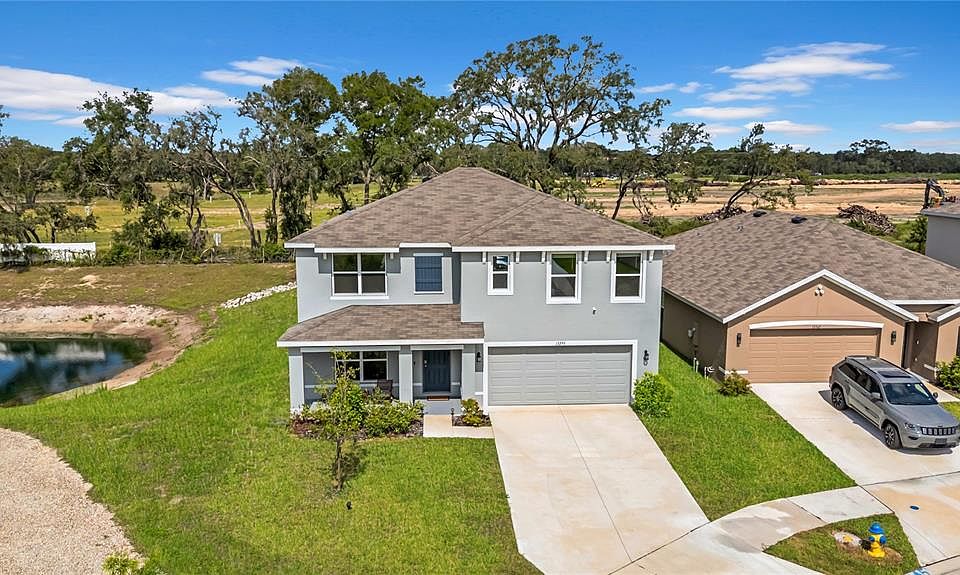 One or more photo(s) has been virtually staged. This beautiful 5-bedroom, 3-bath home with a spacious loft and large flex space sits on a premium corner lot with pond views in the boutique community of Pine Creek. Built in 2024, this thoughtfully designed home offers the perfect layout for comfort, flexibility, and function. The main floor features a versatile flex room, a full bathroom, and a private bedroom ideal for guests or multigenerational living. Upstairs, you'll find four additional bedrooms, two full bathrooms, a large loft, and a convenient upstairs laundry room. The primary suite is exceptionally spacious, featuring two oversized walk-in closets and a private en-suite bath designed for relaxation. Located just off the Suncoast Parkway, Pine Creek offers quick access to Tampa International Airport, shopping, dining, and outdoor adventure. Smart home features, solid concrete block construction and tranquil nature views make this home the total package. Don't wait make this beautiful home yours before it's gone!