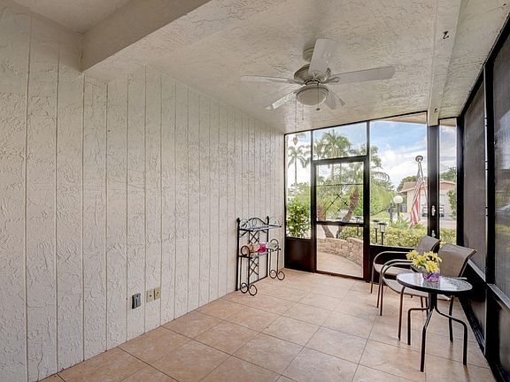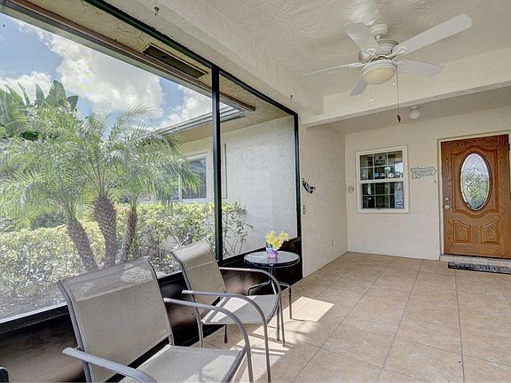 The home features an updated kitchen with large island for cooking, built in pantry. stainless steel appliances, formal dining room with built in by each window, large and oversized living room with sky light, office area and then a third bedroom or den/sitting room. Home features two large bedrooms with updated bath. Enjoy the outside on the large open patio with table and chairs. Screened in front porch with a one car garage. Delray Villas offers its own community pool plus a large community clubhouse on El Clair Ranch Rd with pool, spa and fitness center. The Community Pool is just across the street from the house. Home is close to shopping, restaurants and of course down town Delray.