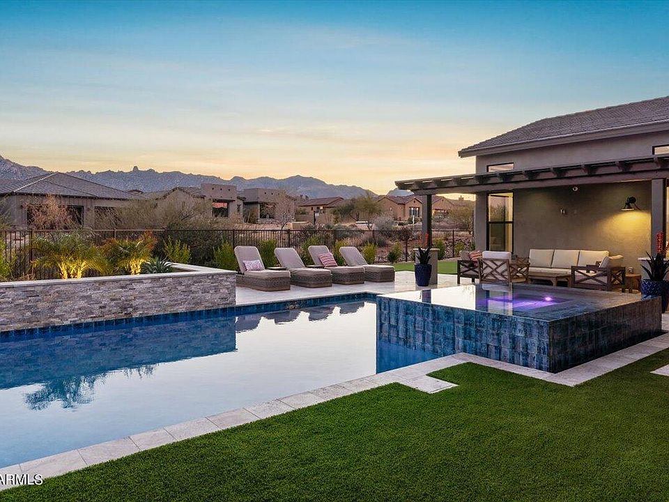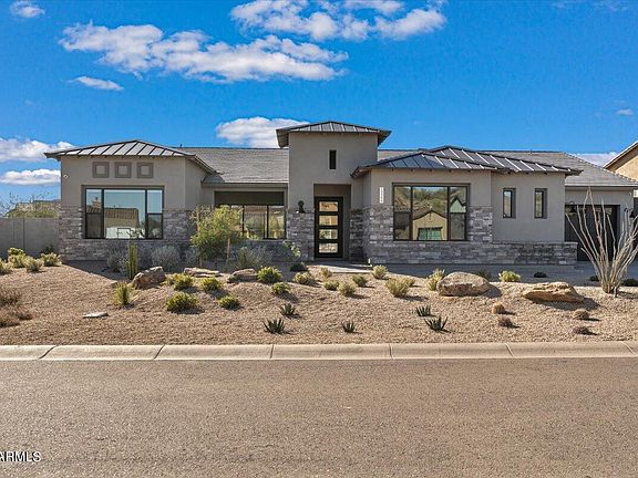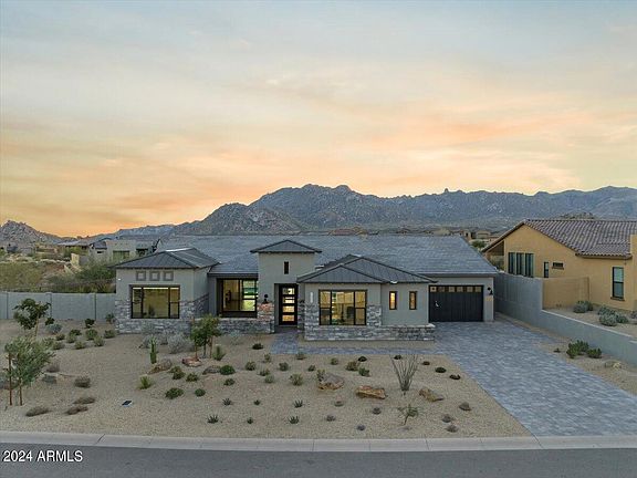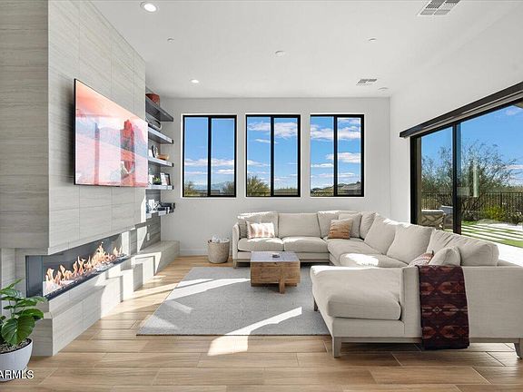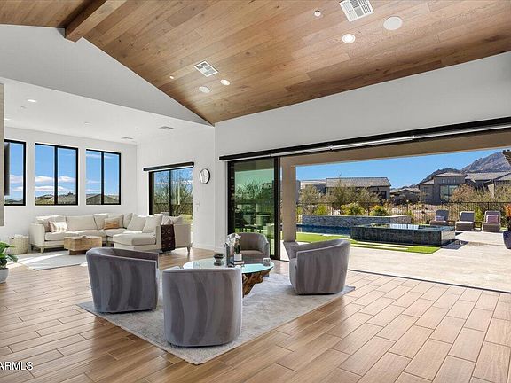 Light and bright and lightly lived in, this one-year-old home in Storyrock offers outstanding views of Four Peaks and the McDowell Mountains. Built by David Weekley Homes, this popular Fraesfield model has an open great room, split master floor plan, and views can be enjoyed from all of the main living areas. Over $300k spent on backyard landscaping and pool/spa. Seamless indoor/outdoor living is achieved by the 90-degree multi-slide doors at the family room and casual dining areas of the great room. The modern, sleek kitchen includes a large waterfall island with Calacatta Quartz countertops and backsplash, upgraded cabinetry that extends to the ceiling, luxury stainless steel appliances including a Sub-Zero refrigerator and 6-burner Thermador cooktop, Butler's pantry with sink and built in cabinetry, and a separate walk-in pantry. The cozy TV area has a modern linear fireplace with floor to ceiling tile and floating shelves. The primary bedroom offers a luxurious ensuite bath with dual vanities, luxe shower with seating and closet with custom built-ins, while the secondary bedrooms each have walk-in closets and private baths. Wood plank ceilings in the great room and primary bedroom, motorized window shades throughout, wet bar at the casual dining area, a drop zone at the garage entry, an epoxied 4-car garage, tankless water heater and whole house water treatment system are some of the many additional thoughtful upgrades. Step outside and discover the resort backyard, complete with a large pool, raised spa with negative edge spillover, built in BBQ, firepit, putting green, artificial turf areas, expansive use of travertine tile, extended covered patios and stunning views of the McDowell's and Four Peaks. Furnishings available by separate bill of sale.