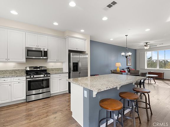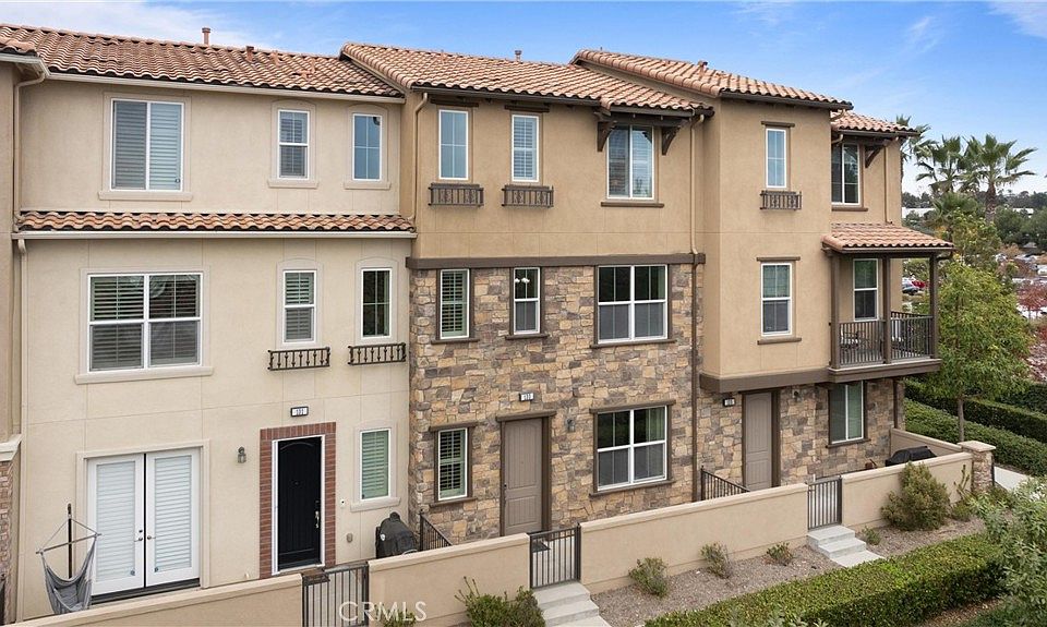 Welcome to the Mission Viejo lifestyle. Enjoy the incredible views from this 11 year old, three bedroom - 3 1/2 bathroom townhome. Stop and enjoy the mountain and city light views from the spacious patio. Enter the main floor from the two car garage or through the front door to the tiled entry with a spacious storage closet for shoes and coats. The main floor bedroom has a private bathroom and walk-in closet and is great for guests or for an office. Up the stairs you'll find a massive living room with wonderful views, gleaming laminate floors, ceiling fan, plantation shutters and an entertainment nook. Create culinary masterpieces in the bright kitchen with an island that seats 3, a separate dining space, granite counters and stainless appliances. An additional balcony has a space for a BBQ and seating area. The inside laundry room has storage cabinets and tile floors. A half bathroom on this level is perfect for guests. The top floor has the primary suite with more views, plantation shutters, ceiling fan, and a coveted walk-in closet. The primary bathroom has a separate tub and shower, double sinks and private toilet room. The 3rd bedroom also has it's own bathroom, plantation shutters and a ceiling fan. Enjoy the tankless water heater in the spacious two car garage. The community offers a pool and spa and places to BBQ. Walk to Target and multiple restaurants.