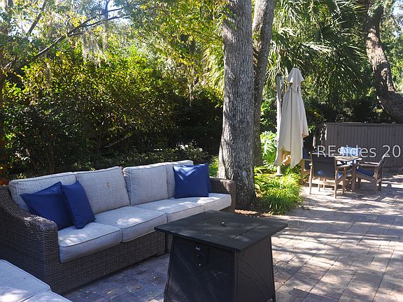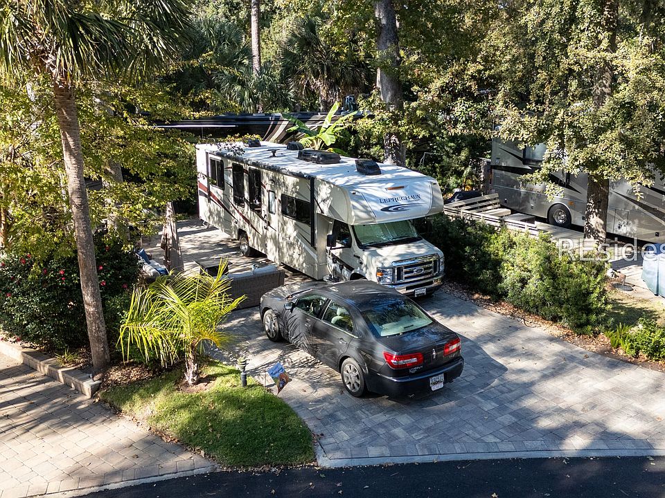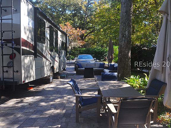 This beautiful RV Lot with paver pad, storage shed can accommodate a 45' RV with room for car in front. Both patio sofas with firepit, tables with 4 chairs and umbrellas, and shed will convey with the lot. Hilton Head Island Motorcoach Resort is a luxury RV resort consisting of 50 acres of woodland setting accented with lush landscaping settled in the heart of HHI and is a short bike ride to Coligny Beach, restaurants and shopping. HHIMR amenities include tennis courts, pickle ball, shuffleboard, pool, hot tub, clubhouse, laundry facilities, fitness center, basketball courts, playground, dog park, Wi-Fi, cable, and daily trash pickup