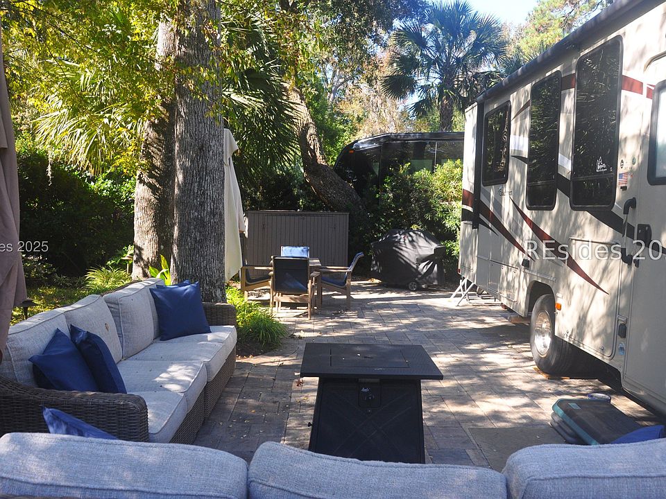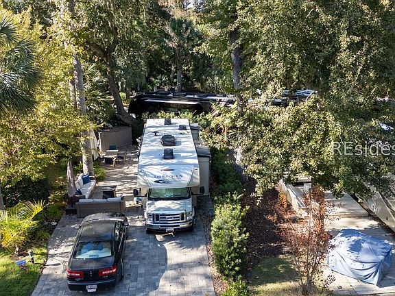 This beautiful RV Lot with paver pad, storage shed can accommodate a 45' RV with room for car in front. Both patio sofas with firepit, tables with 4 chairs and umbrellas, and shed will convey with the lot. Hilton Head Island Motorcoach Resort is a luxury RV resort consisting of 50 acres of woodland setting accented with lush landscaping settled in the heart of HHI and is a short bike ride to Coligny Beach, restaurants and shopping. HHIMR amenities include tennis courts, pickle ball, shuffleboard, pool, hot tub, clubhouse, laundry facilities, fitness center, basketball courts, playground, dog park, Wi-Fi, cable, and daily trash pickup