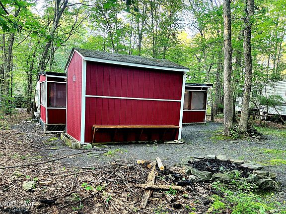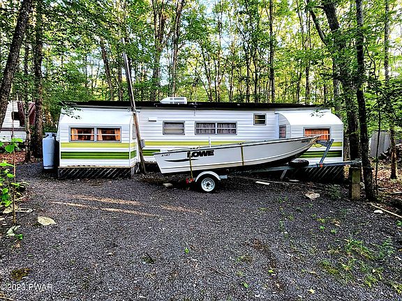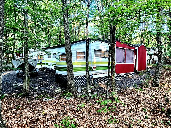 Own your own Pocono Mountains vacation getaway in the amenity filled RV community. Trails End is an amenity filled community with an Olympic sized pool, game room, snack bar, clubhouse, basketball courts, baseball fields, and playgrounds with 24-hour security. This older, well maintained RV is situated on wooded, level lot. This adorable dwelling includes the 2 bedrooms, 1 bath trailer with an adjoining bonus room with a bar that nearly doubles your living space! Completely furnished and turn key! The property also includes a large shed for storage and a firepit area! Pictured fishing boat and trailer are included in the sale! Trails End is located just 2 hours from NYC and Philly! It is convenient to state game lands, hiking trails, the Delaware River, Lake Wallenpaupack, Milford & more!, Beds Description: 2+Bed1st, Baths: 1 Bath Level 1, Sewer: WS Comm Central