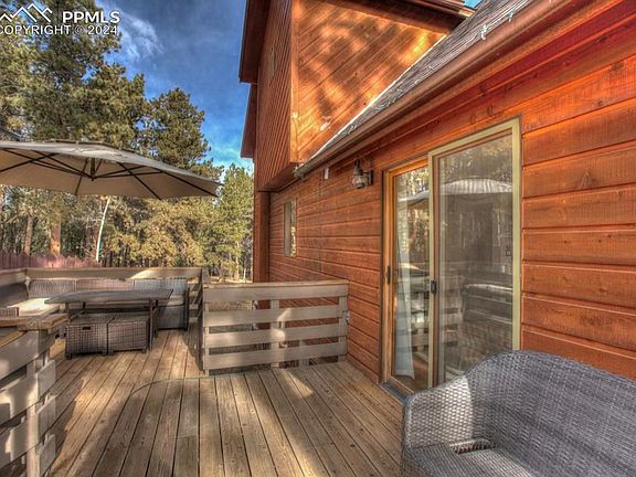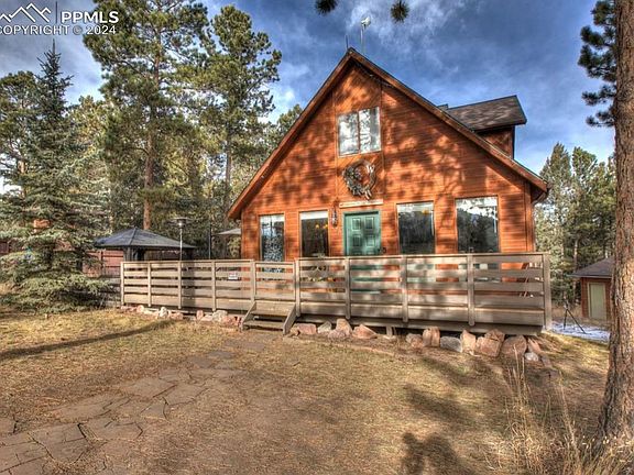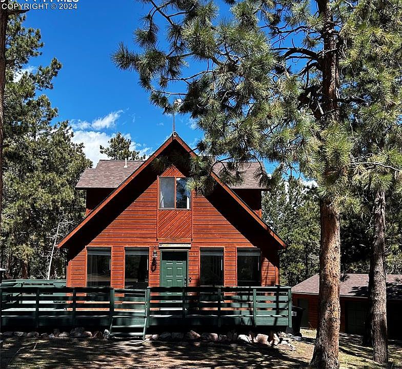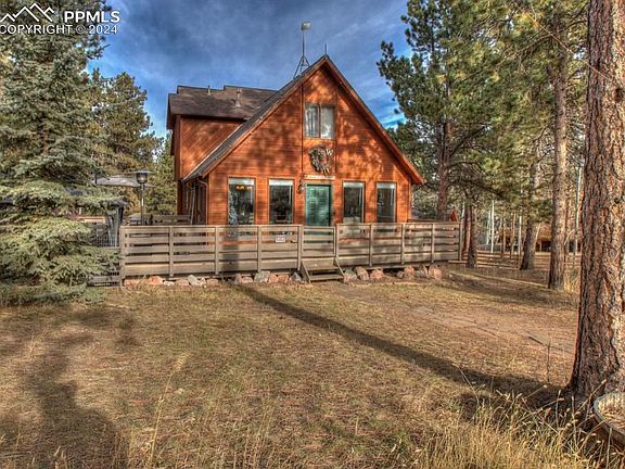 Nestled in the serene beauty of Woodland Park, Colorado, this charming A-frame home offers a perfect blend of comfort and tranquility. Tucked away towards the end of a peaceful cul-de-sac, this 3-bedroom, 2-bathroom residence boasts an inviting atmosphere ideal for both relaxation and entertainment. As you enter, you're greeted by a welcoming ambiance, accentuated by the custom granite mountain backsplash in the kitchen, adding a touch of rustic elegance. The floor plan seamlessly connects the kitchen, dining area, and living space, creating an inviting environment for gatherings and everyday living. The property spans an expansive 0.75 acres, providing ample space for outdoor activities and enjoying the natural surroundings. The rear of the property is fenced, offering privacy and security, while the abundance of trees adds to the picturesque setting. Convenience is key with an attached garage providing shelter for your vehicles, along with a detached 2+ car garage, offering plenty of storage space for your outdoor gear and recreational equipment. With its idyllic location, charming features, and ample space both inside and out, this Woodland Park retreat presents a rare opportunity to embrace the beauty of mountain living while enjoying the comforts of home.