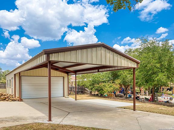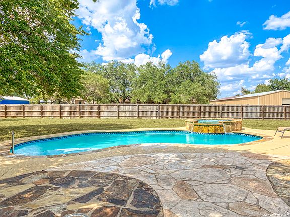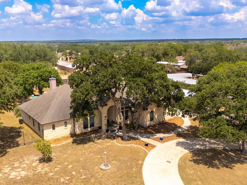 An exceptional property that checks all the boxes! Situated on over 1 acre of wooded countryside in La Vernia's beautiful Copper Creek Estates neighborhood with No HOA, discover this 100% Stone Home + Insulated Metal Shop + Sparkling POOL & Hot Tub + Expansive Covered Patio & Outdoor Kitchen! The circular driveway welcomes you to this exceptional home, featuring open living spaces with all-tile flooring, and a great layout with space for a home office. Gourmet Island Kitchen with Thermador Appliances: 6-burner Gas Cooktop, Double Ovens, Dishwasher; plus Sharp built-in drawer style Microwave! Gleaming high-grade granite in abundance, with custom pull-out cabinetry for ideal storage & convenience. The Master Retreat boasts dual closets (one connects to laundry room), dual vanities, and an extra-large soaking tub + walk-in shower. Enjoy Fabulous Outdoor Entertaining on the Vast Covered Back Patio: Rock & Granite Outdoor Kitchen w/Grill, Sink, Refrigerator space, Storage, and gas stub for connecting more cooking gear! Additional patio space extends to the Pool for refreshing fun year-round in the heated Hot Tub! The workshop is newly constructed in 2025, and is 20'x30' inclosed & insulated, plus 20'x33' carport. Partial irrigation sprinkler system front & back. This property is set up with all the "extras" and ready to host new owners!