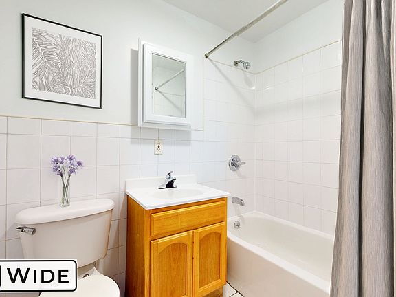 Bathroom offers a full size bathtub, sink and vanity with built-in storage, and crisp, white tiling throughout. Not to mention a large walk-in closet near the entry!