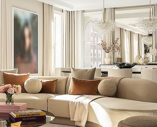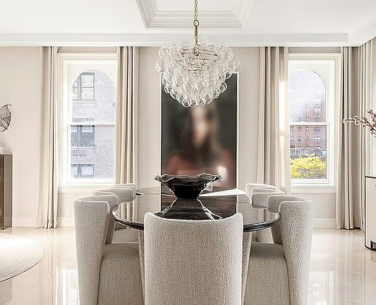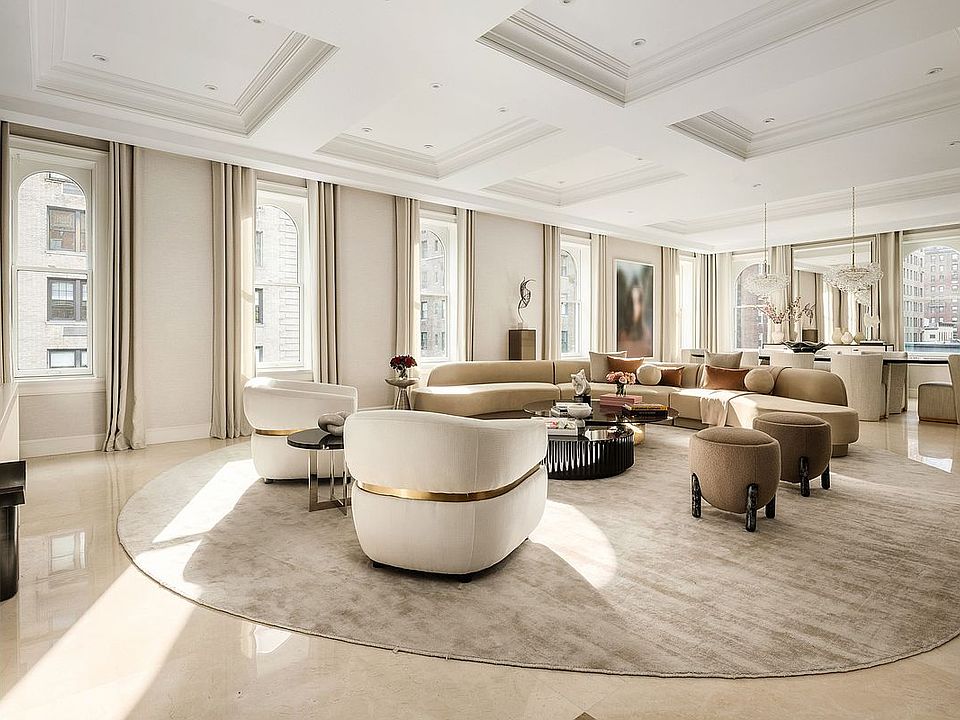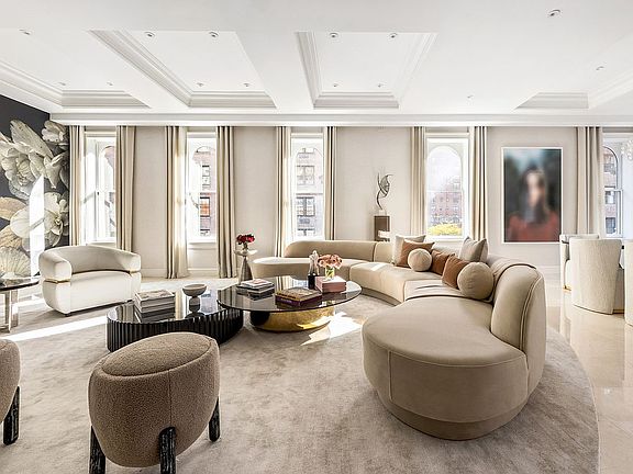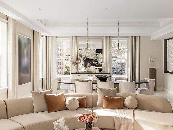 Ushered into the home via a private elevator, you are welcomed into a handsome gallery with lovely millwork that leads to an expansive great room that overlooks the corner of Lexington and 73rd. Drenched in natural light, with Crema marble flooring and beautifully coffered ceilings, this is a truly stunning and sophisticated living and dining space.