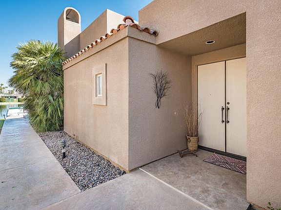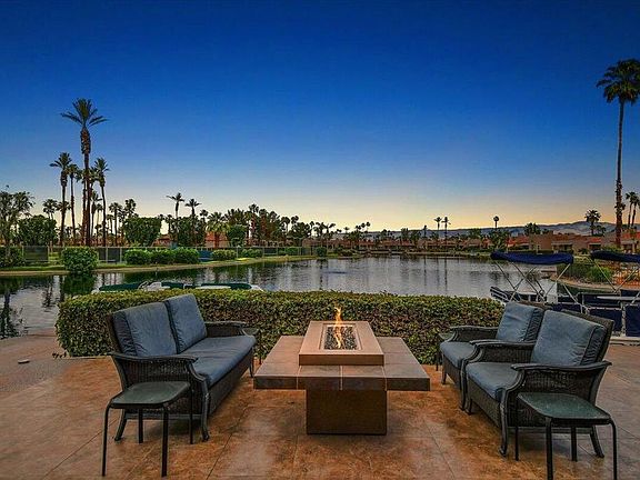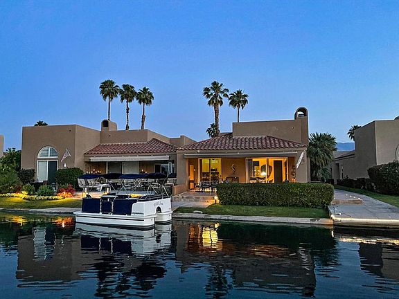 This beautiful lake front home located on the largest lake in Lake Mirage Racquet Club is a Must See! Enjoy the spectacular water and mountain views while relaxing on the oversized patio, complete with electric awnings, misters, fire pit for those cool nights, built in BBQ and private boat dock. This spacious home includes 2 bedrooms plus den, 3 bathrooms, large openliving area with gas fireplace, high ceilings throughout, updated kitchen with stainless steel appliances, carpet and tiled floors, and ceiling fans. This home comes partially furnished per inventory list. When you are not boating/kayaking on one of the two beautiful lakes you can enjoy 7 tennis courts (6 lighted) , 6 pickleball, 11 pools and spas. A 2004 Electra Craft - Completely Redone - 16ft Catamaran Series is available for purchase outside of Escrow. Lake Mirage Racquet Club is located in the heart of the desert, just a short walk/drive to restaurants, grocery stores, Eisenhower Medical Center, McCallum Theatre and easy access to the Palm Springs Airport.