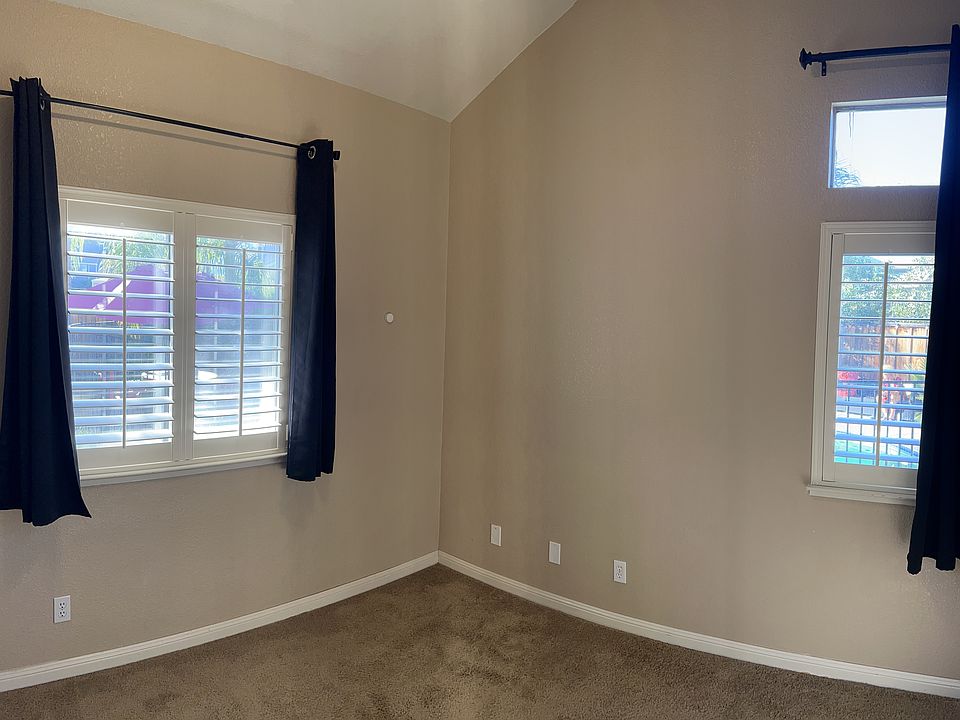 The room has had a recent touchup on the paint job and a deep clean. The floor is carpeted. The room is heated and cooled by the same system as the rest of the house, which is controlled by a Nest thermostat located at the bottom of the stairs. This room also includes a ceiling fan and two windows for lots of natural light when desired. However, the windows also include plantation shutters and thick curtains to limit the heat on hot summer days.