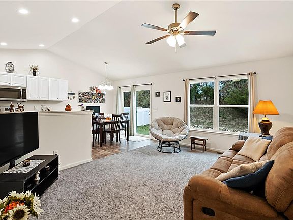 Nestled in a quiet neighborhood, this charming, well maintained 5 year old home is a 3-bedroom, 2-bathroom home offering the perfect space for family living. The bright and airy living room features large windows flooding the space with natural light. The kitchen boasts sleek countertops, stainless steel appliances, and plenty of cabinet space. The vaulted ceiling in this open floor plan is accented with recessed can lights, brushed nickel lighting, and ceiling fan. The master suite includes an en-suite full bathroom. The divided floorplan makes the other bedrooms perfect for children, guests, or a home office. Located in a newer neighborhood, this house is perfect for families looking for comfort and convenience. There is an attached 2 car garage with a custom made little closet as well. The landscaping is nicely done. Enjoy outdoor gatherings in the private backyard that backs to woods with a patio area perfect for entertaining.