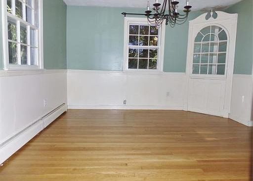 Well maintained Garrison Colonial. Four Bedrooms and one and a half baths. Living room features a brick fireplace. Nice built ins cabinets in the dining room. Kitchen has extra cabinets and includes the refrigerator. Just off the kitchen is a delightful three season Sun Room with cathedral ceiling and exposed beams. Basement is partially finished and makes a great family room. The entire home including the stair case has gleaming hardwoods--just refinished! Interior is freshly painted and the yard is surrounded by beautiful trees. Ready to move in!!! Living area of the home is 1470 plus 350 in basement for a total of 1820.