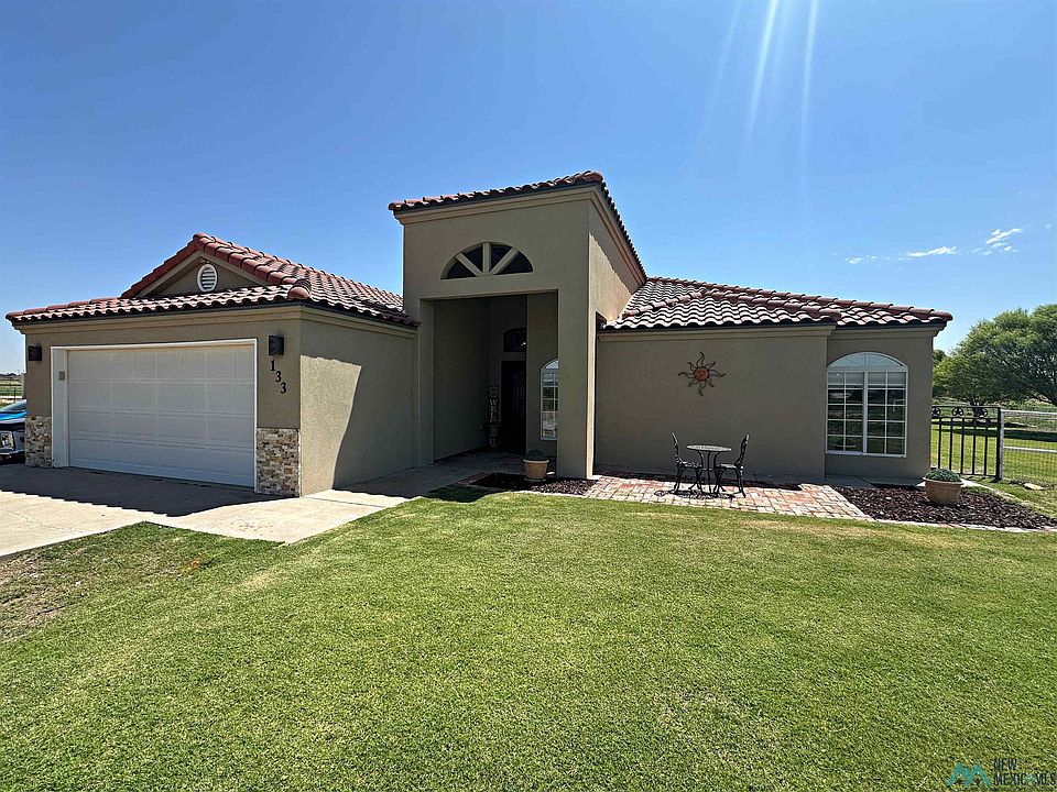 This country property on 5 acres in Buena Vida blends rustic elegance with a touch of Spanish flair, shown by its classic terracotta tile roof. Inside you will feel the warmth and character of this custom built home. Soaring vaulted ceilings, an open concept living and dining area that create a spacious, inviting atmosphere with a striking fireplace, as well as a kitchen that is easily accessible. The primary bedroom is spacious and includes a sliding glass door that opens to the backyard. French doors from the living room allow access to the covered patio and built-in firepit--great for gathering with friends and family or just relaxing under the stars. The backyard also has a large grassy area with mature trees and pipe fencing. There is also pipe fencing all around the properties perimeter, plus corrals, and a 15x30 two-stall barn. Don't miss your chance to own this little piece of heaven. Call today for a tour!
