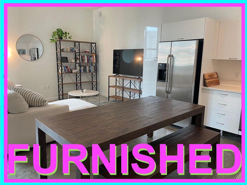 Fully furnished 1-bed loft apartment with 10-foot ceilings, in-unit washer/dryer, wifi, standing desk, rolling desk chair, and private building amenities (gym, rec room, lap pool, rooftop pool, hottub, sauna). The gym has a full dumbell rack, free barbells, a smith machine, several threadmills, and various other machines.