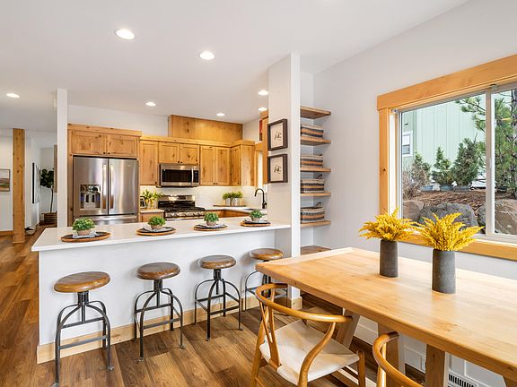 Nestled within the charming area of NorthWest Crossing, lies this gem of a home, offering walking access to the vibrant Bend's Westside. Enjoy biking to Phil's Trail, Shevlin Park, or a quick drive to Mt. Bachelor right from your doorstep. Take leisurely strolls to nearby restaurants and the NorthWest Crossing Farmers Market on weekends. Only 21 miles to Mt.Bachelor, beating the traffic! Boasting a thoughtfully crafted layout including 3 bedrooms and 2.5 bathrooms, an inviting open kitchen, dining area and conveniently placed suite on the main floor. Vaulted ceilings, rich real wood trim & doors throughout and custom closet cabinetry! Upgraded kitchen with high-end finishes, while the gas fireplace sets a relaxing mood in the great room. Recent upgrades include a brand new roof, lushly treed lot, epoxy garage floor & built-in storage for all the Bend toys! Meticulously maintained and cherished, this home exudes warmth and comfort in an unbeatable location!