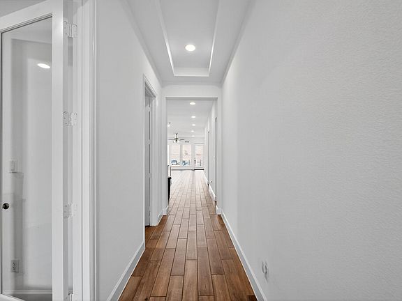 Escape to serenity in this stunning 3-bedroom, 2-bathroom single-story home in Bastrop, perfectly positioned to back up to a serene greenbelt. The modern exterior boasts a well-groomed front yard featuring xeriscape elements, setting the tone for a peaceful retreat. Upon entering, you'll be greeted by the bright, open, and airy entryway with charming tile flooring and high ceilings. The spacious living room is flooded with natural light, thanks to a wall of windows, and features recessed lighting and a ceiling fan for added comfort. The living room seamlessly connects to the sun-drenched dining area and offers direct access to the backyard and covered patio, the perfect spot to enjoy the peaceful views of the greenbelt. The covered patio is a true oasis, large enough to accommodate outdoor furniture and perfect for outdoor dining or simply taking in the surroundings. The fully fenced backyard provides a safe and private space to relax and unwind. Inside, the kitchen is a true showstopper, featuring a long breakfast bar, center island, quartz countertops, built-in microwave over oven, pantry, and decorative tile backsplash throughout. A designated office space off the entryway offers flexibility and can be used as a home office, reading nook, or however you'd like. The primary suite is a serene retreat, boasting an en-suite bathroom with separate vanities, recessed lighting, large walk-in shower, deep soaking tub, and walk-in closet. Both secondary bedrooms feature high ceilings and ample closet space. This community offers a plethora of amenities, including two community pools within walking distance, dog parks, playgrounds, walking trails, a lake house, gym, pickle ball courts, and a Frisbee golf course. Come make this house your home and enjoy the perfect blend of peace and recreation.