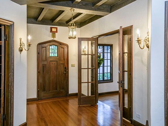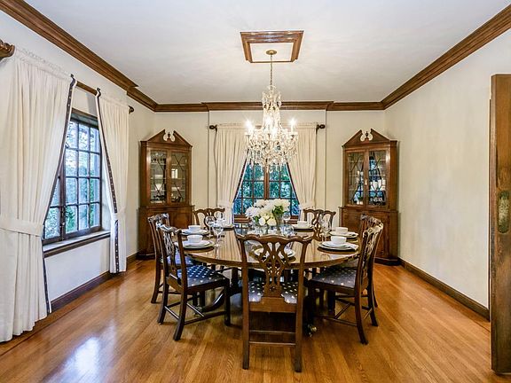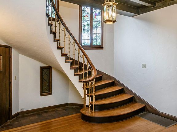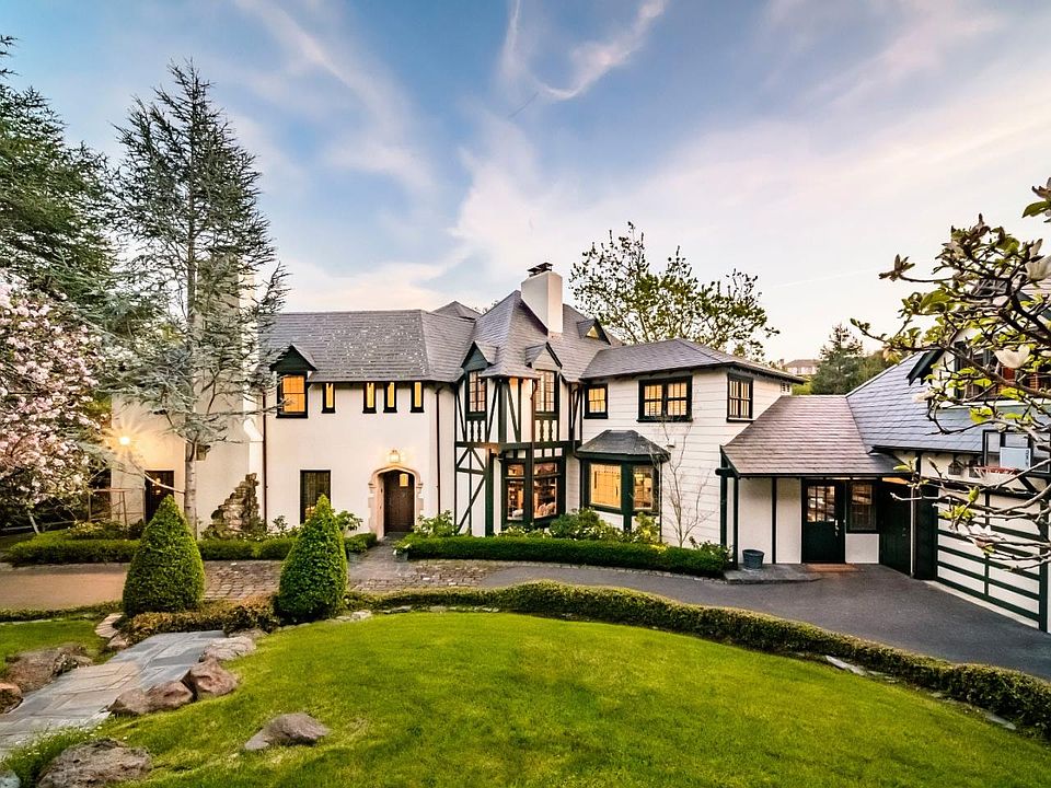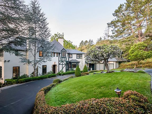 Beautifully situated on over a 1.4 acre gated storybook location, this exceptional, five-bedroom, 5.5 bath home is architecturally significant. Original features of handcrafted quality, including wrought-iron hardware, hardwood floors, & leaded and stained-glass windows are complimented by smart modern conveniences. The main floor has a gracious entry with powder & cloakroom, formal dining room, fire-placed living room with French doors, & a paneled library, also with a fireplace. The top-of-the-line, eat-in kitchen leads to a rear deck, pool and spa, as well as to an oversized family room with unique, imported English bar, & a huge office-conference room. Four family bedrooms, including en-suite master, two full bathrooms, a study, and a turret retreat and wrapping room comprise the upper levels. A lower level au pair suite with bath and kitchenette and a four car garage ensure privacy and convenience. This rare home exemplifies graceful Tudor charm & ageless Hillsborough elegance.