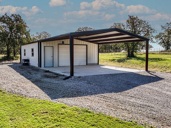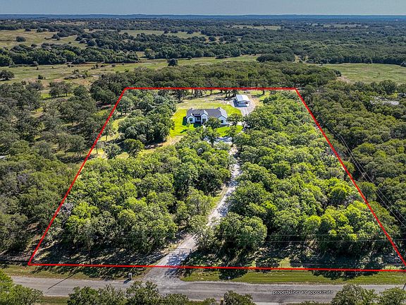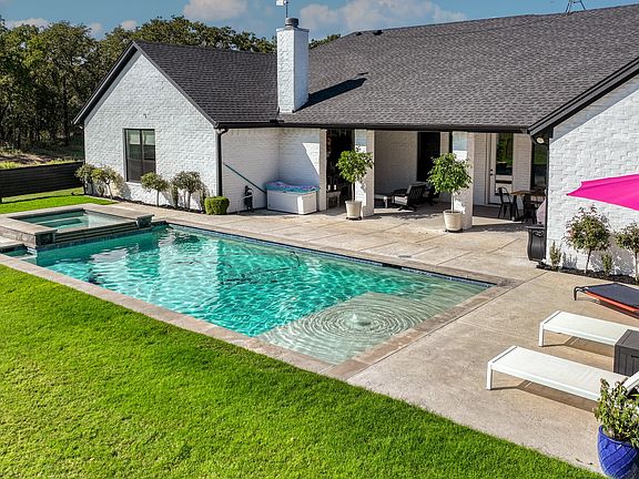 This beautiful 4 bedroom 3 bath home offers a tranquil retreat on 5 secluded acres located in Sweetwater Springs and the highly desirable Peaster ISD. The interior features an open-concept design with split bedrooms, perfect for family living and entertaining. The living, kitchen and dining areas blend seamlessly, showcasing tile floors throughout, a striking rock fireplace with a view of your own private oasis heated pool and spa. A stunning kitchen boasts a large island with stainless steel appliances, a gas cooktop, soft close cabinets with slide-out shelves and granite countertops. A spacious primary suite and stylish modern farm bath offer a peaceful retreat with a big walk-in closet that comes with custom shelving. Additional highlights include a large utility room with sink and ample storage, as well as a private outdoor living space with a cozy fireplace and wiring for a flatscreen TV. An air-conditioned 25 x 35 workshop with spray foam insulation, a large carport off the front and a lean-to off the back that is perfect for tractor parking completes this exceptional property.