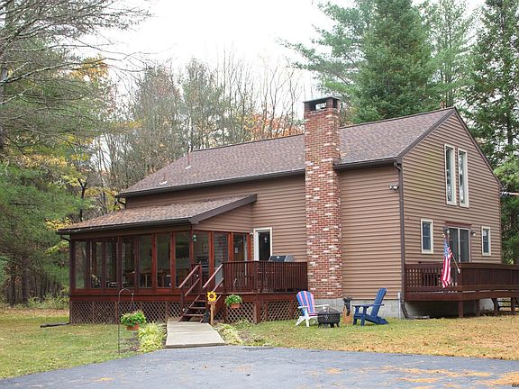 Welcome home to this beautiful 2 beds + bonus space that is in a beautiful country setting. This updated home sits on 3+ acres for a county feel yet minutes from the Northway, close to town. Detached garage + storage! Central air/Central heat. The home is surrounded by trees with lots of natural light and decks to enjoy the outdoors. You will love the 3 season room for additional entertaining space. Shed with water and electric along with a fire pit that sits to the back of the property. Close to Zim Smith Trail for peaceful walks/jogs. The kitchen is completely remodeled. Upstairs master suite is complete with large windows, closet and heated bathroom floor. Basement has zoned heat & bonus room/bedroom, additional space with egress window for finishing. This is a beauty! Must see!