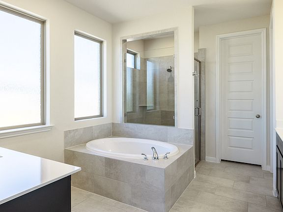 Private home office with French doors embraces the two-story entry. Past the stairwell you enter into the kitchen featuring an island with built-in seating, 5-burner gas cooktop and a walk-in pantry. The dining area boasts three large windows allowing ample natural light. The family room with extended ceilings and a wall of windows leads out to the covered backyard patio. The primary bedroom has three large windows. The primary bathroom features dual vanities, a garden tub, glass enclosed shower, and two walk-in closets. Upstairs you will find the large game room. Secondary bedrooms featuring ample storage and a shared bathroom complete the second level. A secluded guest suite with private bathroom is located off the kitchen. The utility room is centrally located off the living space. The mud room is off of the two-car garage. Representative Images. Features and specifications may vary by community.