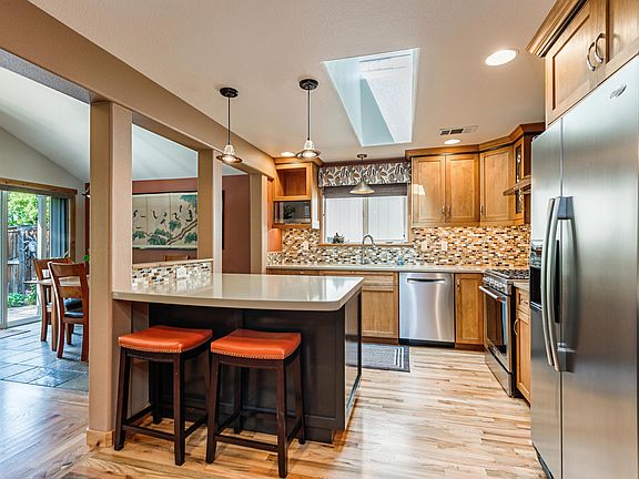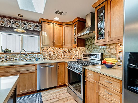 You really have to step inside this beautiful home to appreciate the quality and the amount of upgrades that have been done. Practically a custom home with hardwood floors throughout, quartz countertops and beautiful new custom cabinets in the kitchen with newer high end appliances and custom tile backsplash. Love natural light? Then the skylights and large windows are sure to delight you. The open floor plan makes this home feel much larger than it is, wired for sound in each room, and an out door patio space that is worthy of the title ''park-like''. It doesn't stop there! Solar panels that tie into the electrical panel offset most if not all the electrical bill in any given year. The organic, native and carefully thought out garden in the front and the rear are well established, easily maintained and attract any number of birds and butterflies in your beautiful oasis!