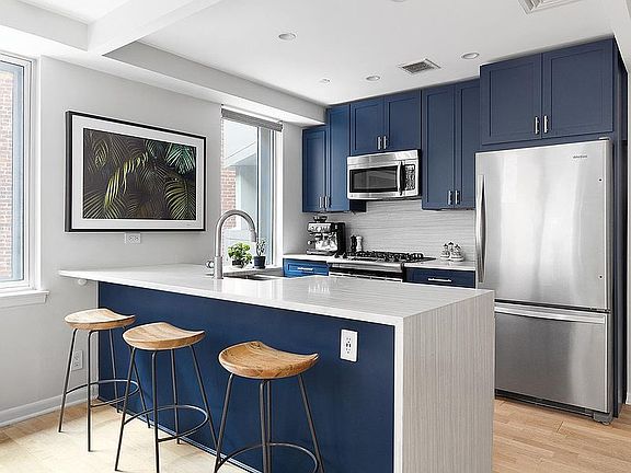 Residence 5A is a corner unit with a renovated kitchen, refinished flooring and updated bathrooms. The kitchen features ample storage, custom wood cabinetry, a stainless steel appliance package, and marble backsplash and countertops.