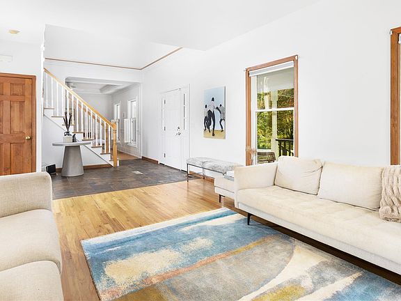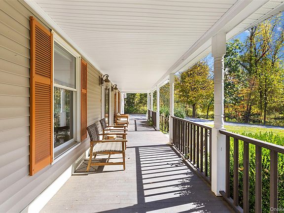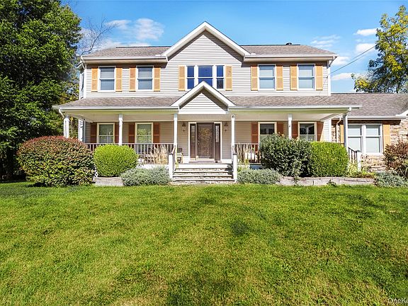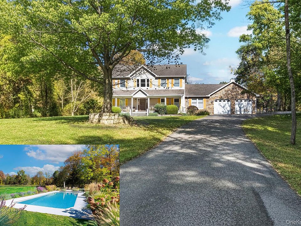 Set on six private acres in Red Hook, this light-filled Colonial blends modern comfort with serene country living. The home opens with a double-height foyer leading to spacious living and family rooms, a bright kitchen with high end stainless appliances, and a dining area with sliding doors that lead to a Trex deck with a new propane line for grilling. Recent upgrades include fresh interior paint, new elevated lighting and ceiling fans, Ecobee thermostats, enhanced landscaping with a leveled native wildflower meadow, and a fully fenced perimeter with keyed entry. The semi finished 1092 sq foot basement provides a myriad of use opportunities. The heated, saltwater pool features a brand-new liner (2024) surrounded by lush gardens and open lawn. Upstairs, the primary suite offers a soaking tub, walk-in closet, and cozy window seat overlooking the property. A spring-fed pond and an expansive 950 sq ft 1800s post-and-beam barn with electric service complete this peaceful, move-in-ready retreat just minutes from Red Hook and Tivoli.